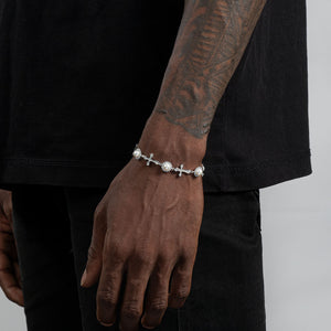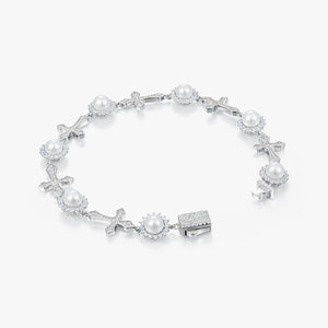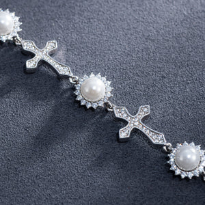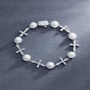 This bracelet combines the elegance of pearls with the symbolism of the cross, each Moissanite stone carefully cut to radiate brilliance. The 925 silver material with white gold plating blends classic and modern styles, perfect for any occasion.