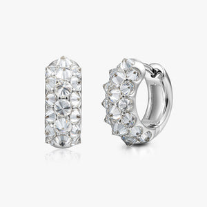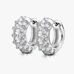 The Hoop Earrings feature an innovative design where each moissanite stone is mounted with its pointed end outward, enhancing the brilliance and sparkle of the stones. This unique reverse setting technique ensures an extraordinary level of light reflection, making these earrings shine with a diamond-like fire.