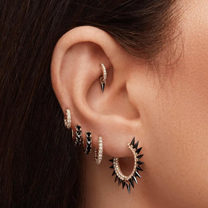 The Hoop Earrings feature an innovative design where each moissanite stone is mounted with its pointed end outward, enhancing the brilliance and sparkle of the stones. This unique reverse setting technique ensures an extraordinary level of light reflection, making these earrings shine with a diamond-like fire.